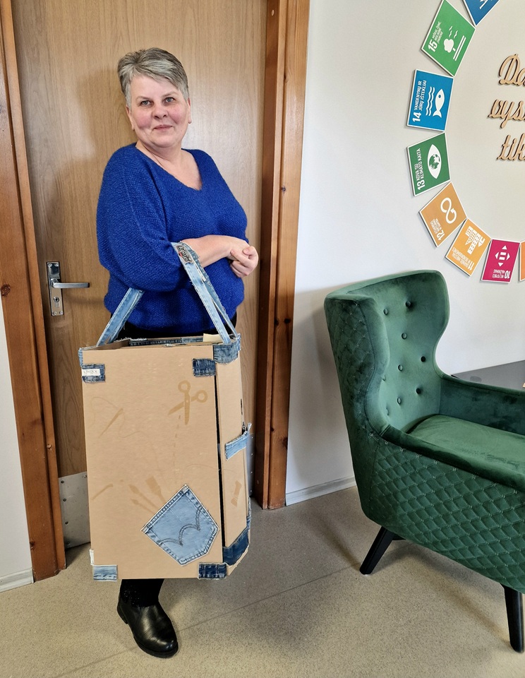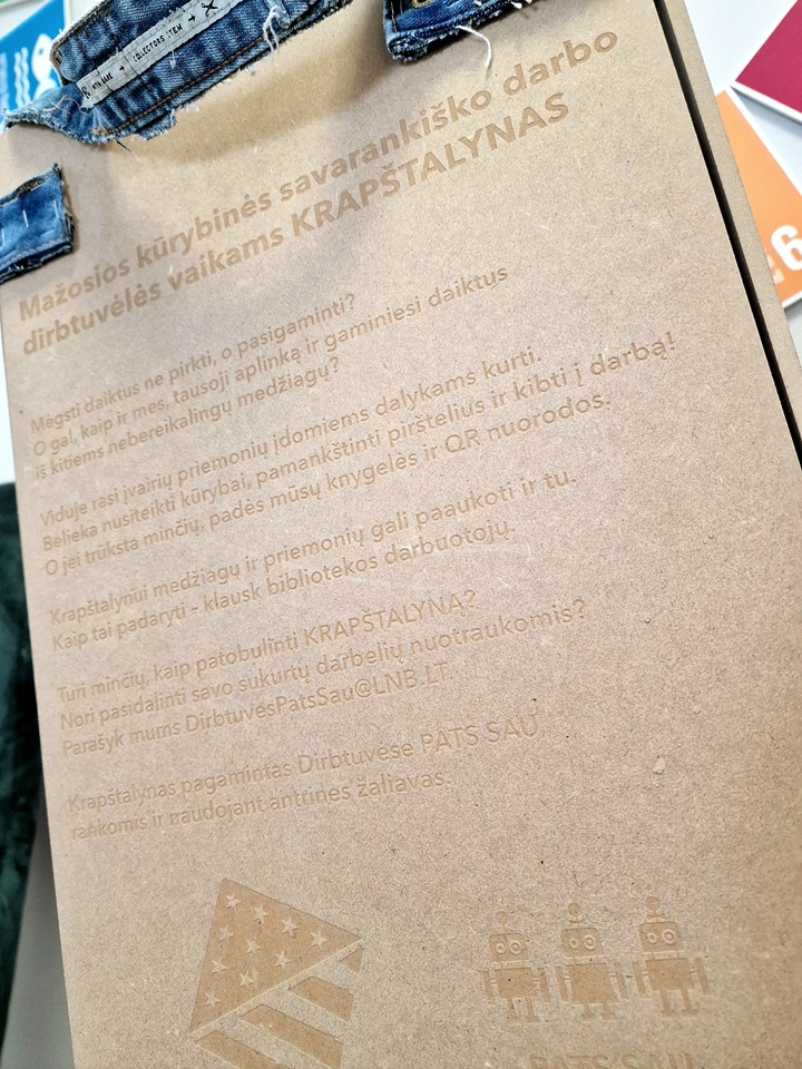 Šis nekomercinis projektas pagamintas dirbtuvių „PATS SAU“ darbuotojų rankomis, naudojant antrines žaliavas – nebenešiojamus džinsus, senus dokumentų segtuvus, antspaudus ir kitas medžiagas.