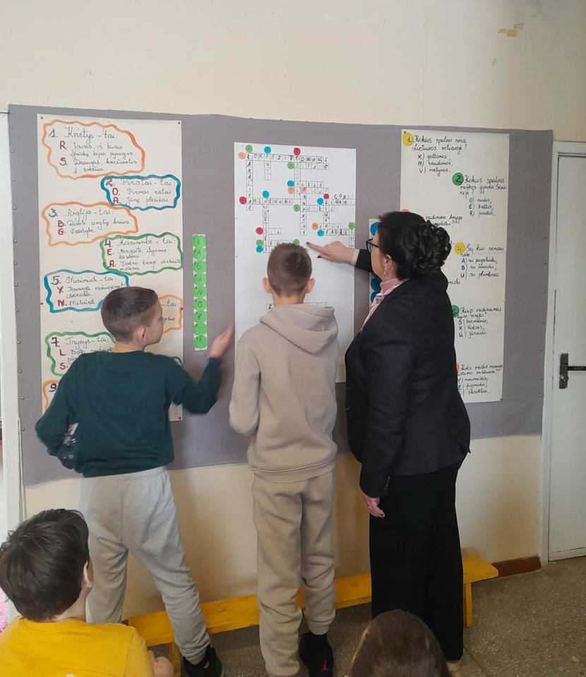 Vėliau vaikai sprendė įvairias užduotis, kryžiažodžius, skaitė patarles ir aiškinosi jų reikšmes.